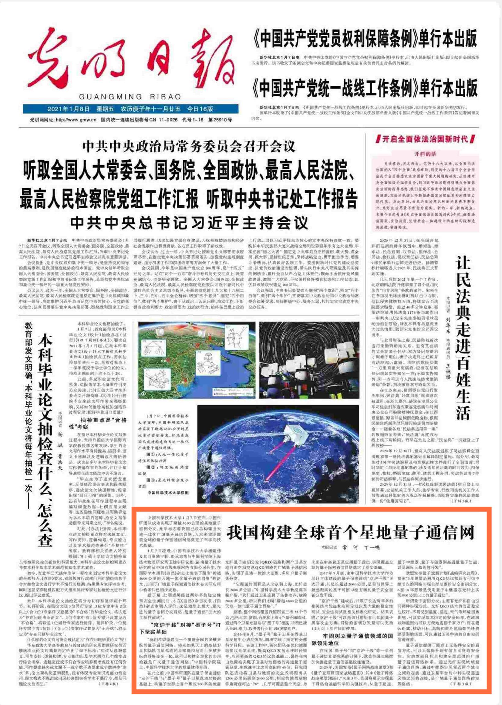 1月7日凌晨,中国科学技术大学潘建伟及其同事陈宇翱、彭承志等与中国科学院上海技术物理研究所王建宇研究组、济南量子技术研究院及中国有线电视网络有限公司合作,在国际学术期刊《自然》杂志上发表了题为“跨越4600公里的天地一体化量子通信网络”的论文,证明了广域量子保密通信技术在实际应用中的条件已初步成熟。