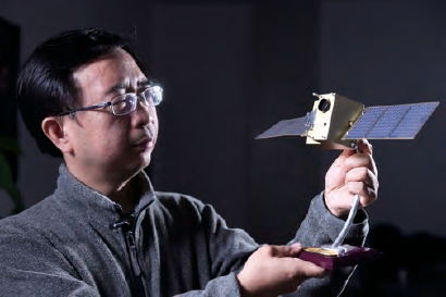 中科院院士潘建伟在办公室内与“墨子号” 量子卫星模型合影。