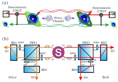 量子中继是在噪声信道中实现长距离量子通信的重要途径,而量子纠缠纯化是量子中继中的关键操作,利用量子纠缠纯化操作可以从两份纠缠度较低的纠缠态中提炼出一份纠缠度较高的纠缠态。此前的纠缠纯化协议都是利用两对低纠缠度的光子对实现,而研究组与合作者提出仅需一对超纠缠光子对的纠缠纯化方案。