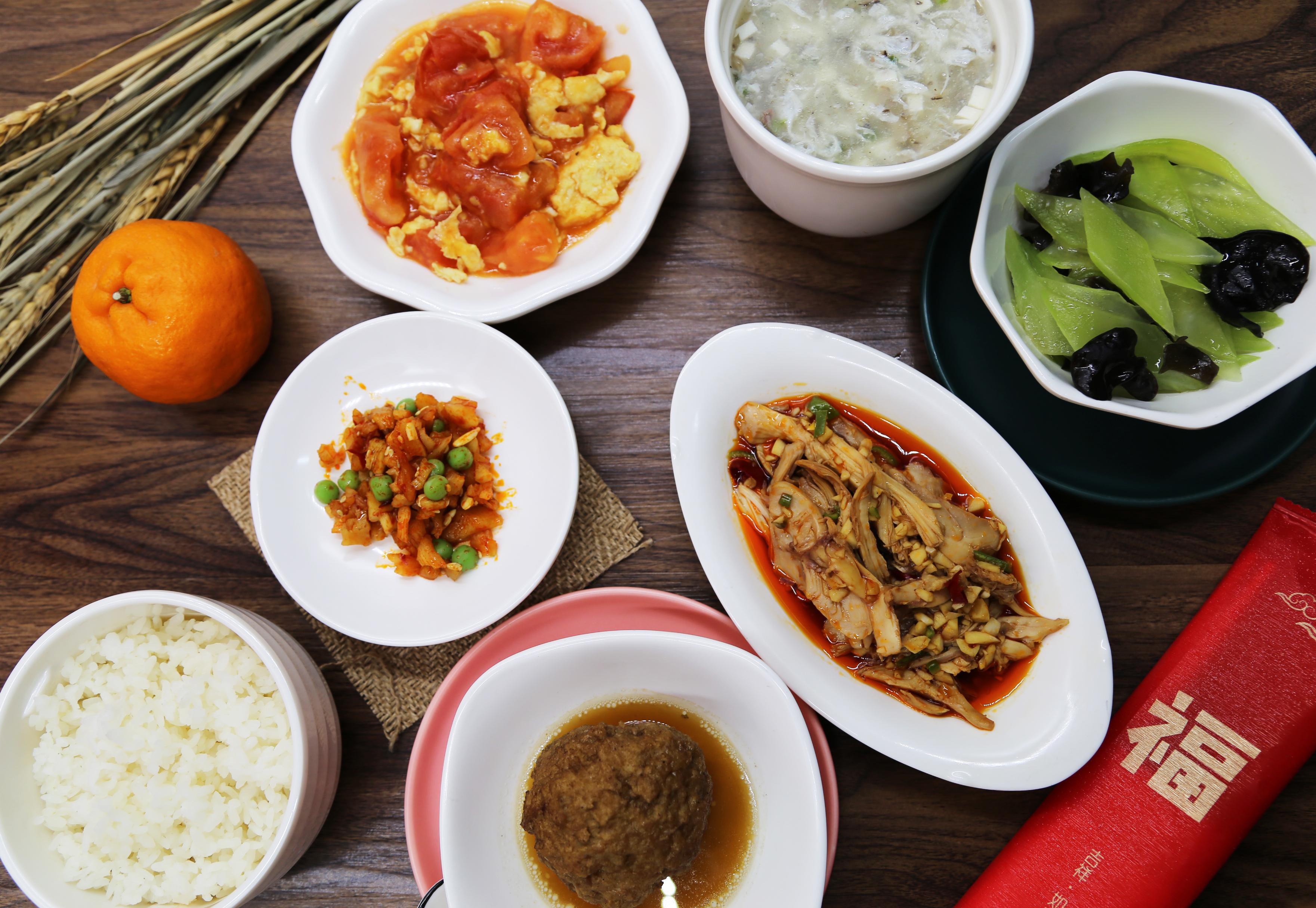 根据推出的菜谱,不仅有红烧狮子头、麻辣口水鸡、木耳炒莴笋、西红柿鸡蛋,还有西湖牛肉羹和小果盘,简直幸福感爆棚。