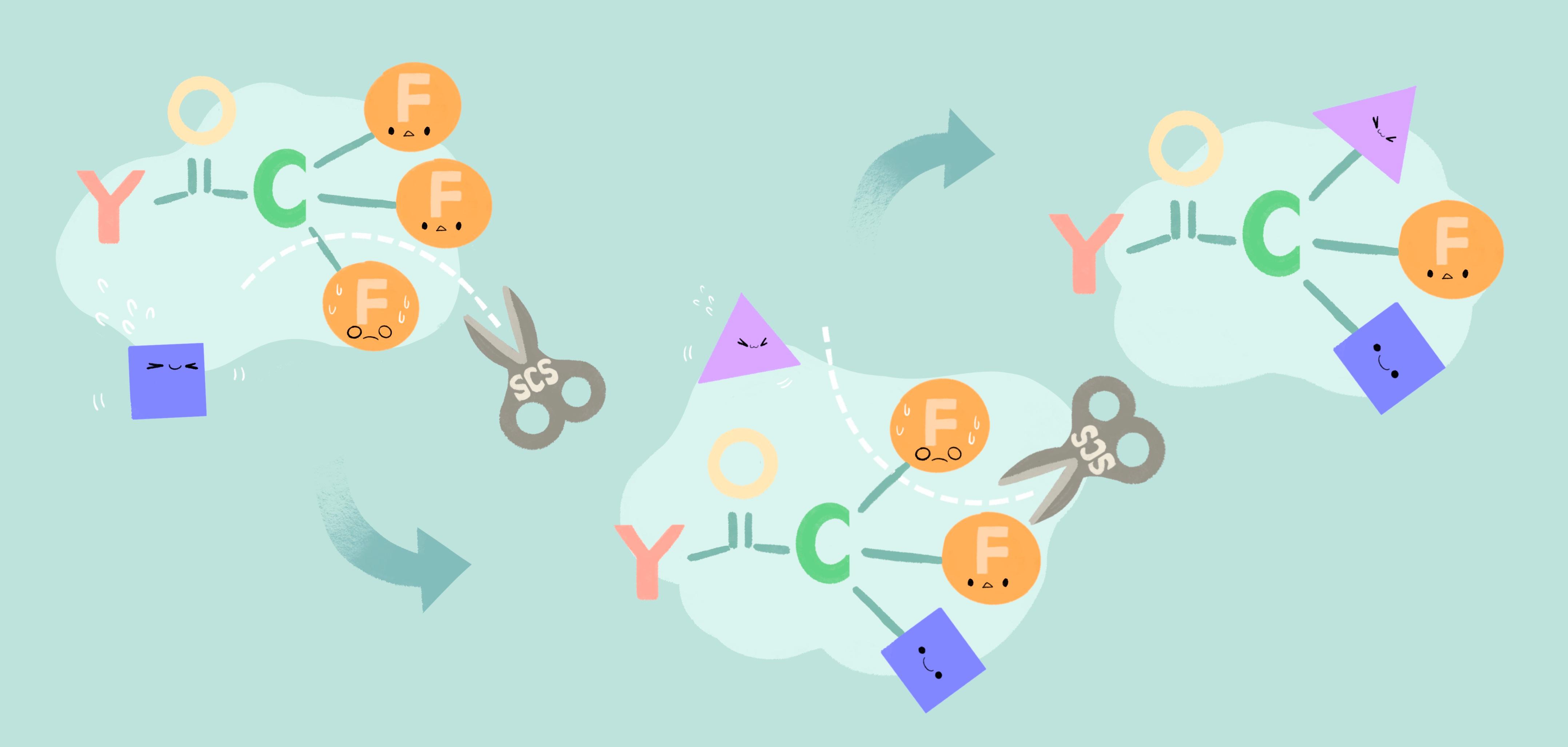 自旋中心转移反应过程第一次剪断三氟甲基中一个“碳—氟”键,使得碳原子和官能团(用方块表示)成键,生成二氟化物;自旋中心转移反应过程第二次剪开产物二氟化物的一个“碳—氟”键,使另一个官能团(用三角形表示)和碳原子成键,生成一氟化物。插画:崔劼