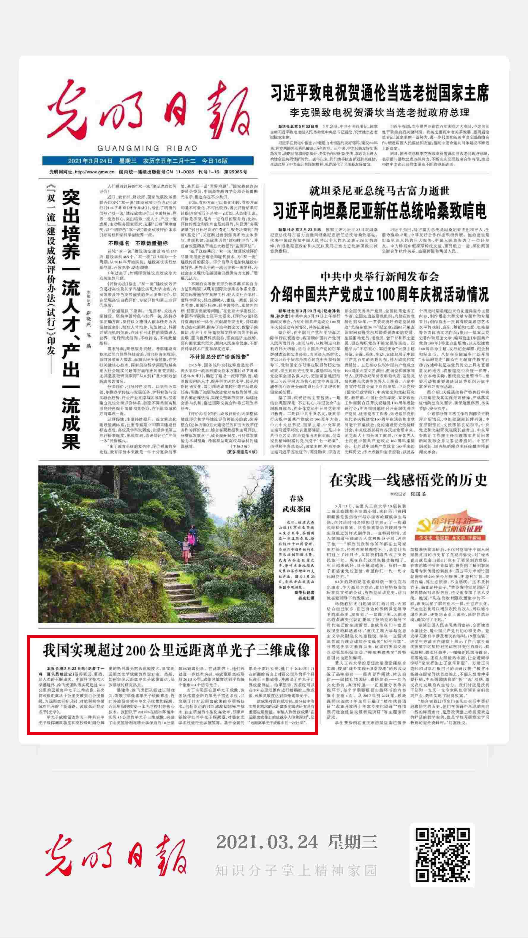 本报合肥3月23日电(记者丁一鸣 通讯员桂运安)看得更远、更清,是人类的不懈追求。中国科学技术大学潘建伟、徐飞虎团队等实现超过200公里的远距离单光子三维成像,首次将成像距离从十公里突破到百公里量级,为远距离目标识别、对地观测等领域应用开辟了新道路。该成果近期发表于《光学》。