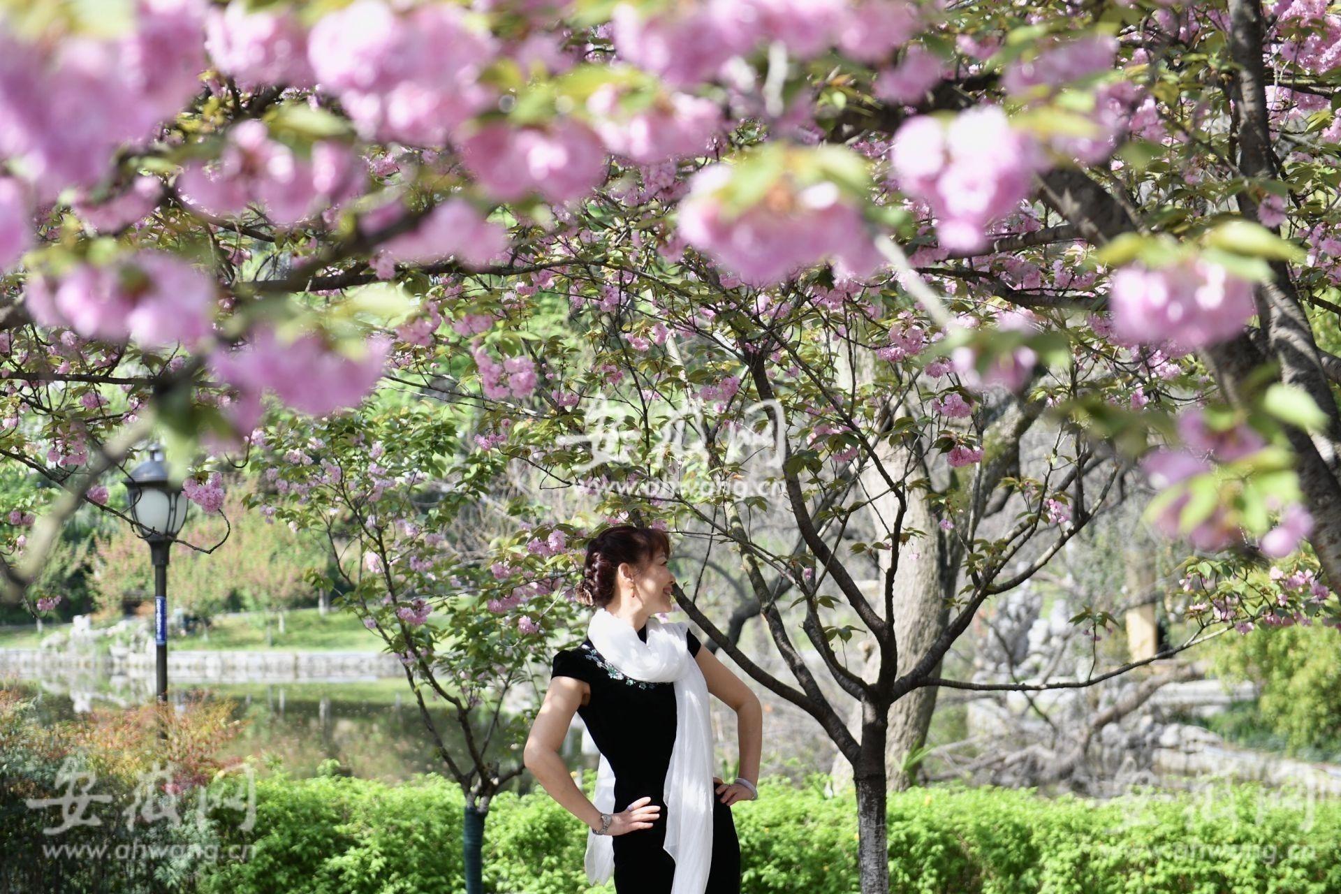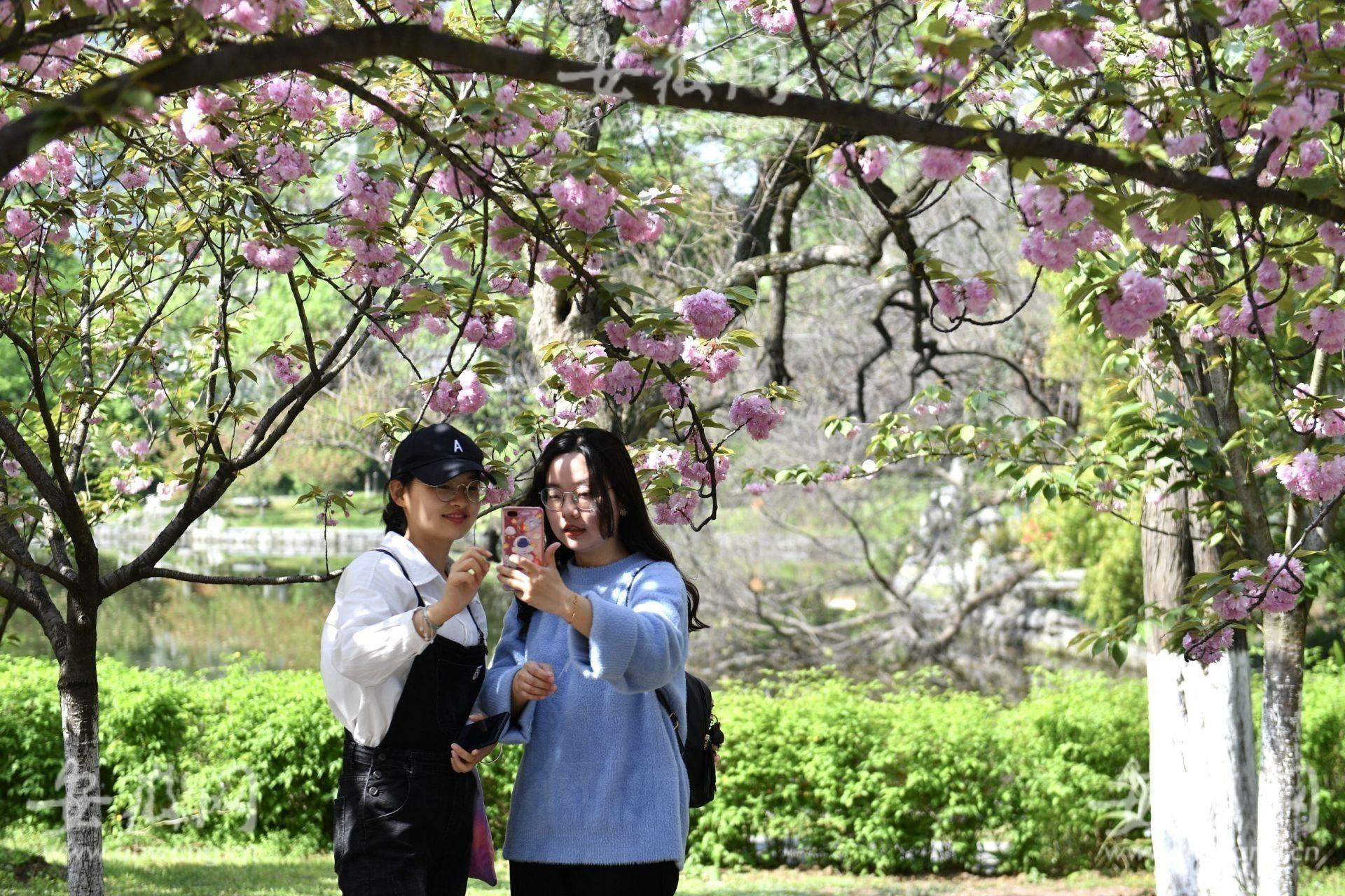 从东区黄山路大门进来,右手斜向,进老北门向南,到教学一楼200米左右的玉泉北路两旁,100多株日本晚樱盛开,粉红色的花朵簇拥在枝条上,娇艳欲滴,随风轻舞,如漾动的朝霞,令人流连忘返。路的西侧中间,有一株罕见的绿色樱花,以其“万红丛中一点绿”的独特与娇贵,不少师生缓缓漫步于花海,一步一景,每一帧都如诗如画。