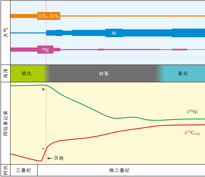 研究人员对剖面进行高精度镍同位素测试后发现,镍同位素的组成与当时海水中的氧气含量以及化学组成具有良好的相关关系。在二叠纪末生命大灭绝层位,镍的含量突然大幅下降。此外,剖面的镍同位素组成非常轻,是35亿年以来沉积岩中最轻的镍同位素组成。