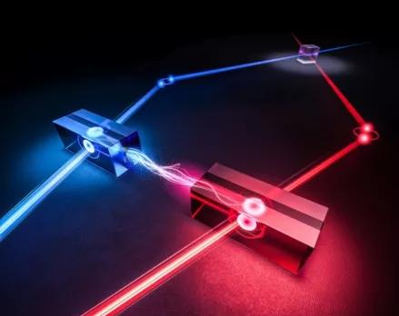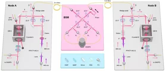 经过多年攻关,科研团队成功使用吸收型量子存储器演示了量子中继的基本链路。一个基本链路由两个分离的量子节点,以及中间站点贝尔态测量装置组成。每个量子节点中除了“牛郎”“织女”量子存储器之外,还各有一个纠缠光子对。实验中,每个纠缠光子对中的一个光子被量子存储器捕获并存储,每个纠缠光子对的另一个光子通过光纤同时传输至中间站点“鹊桥”进行贝尔态测量,测量的过程就是纠缠建立的过程。