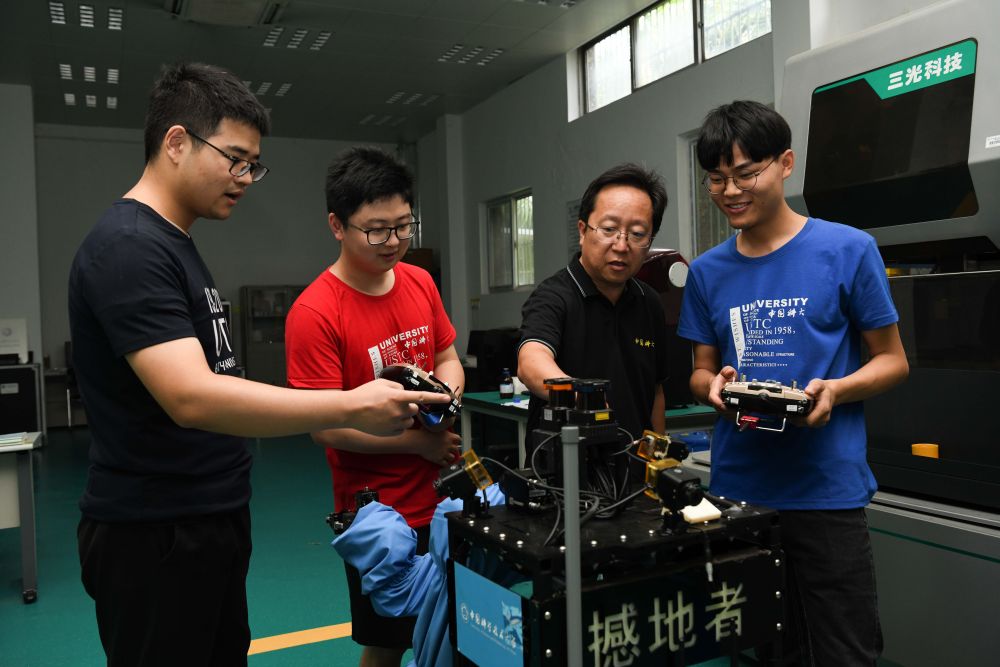 7月1日,在合肥中国科学技术大学创新创业开放实验室内,张世武教授(右二)指导学生进行多功能应急救援机器人的优化测试。