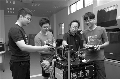 中国科学技术大学创新创业导师张世武(右二)在创新创业开放实验室指导学生进行多功能应急救援机器人测试。新华社记者 张端 摄