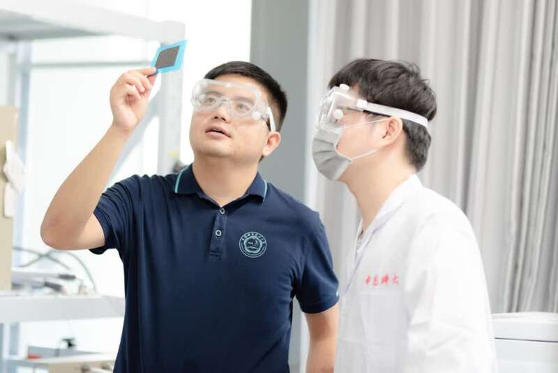 梁海伟教授(左一)与学生一起检查燃料电池膜电极。钱建豪 摄