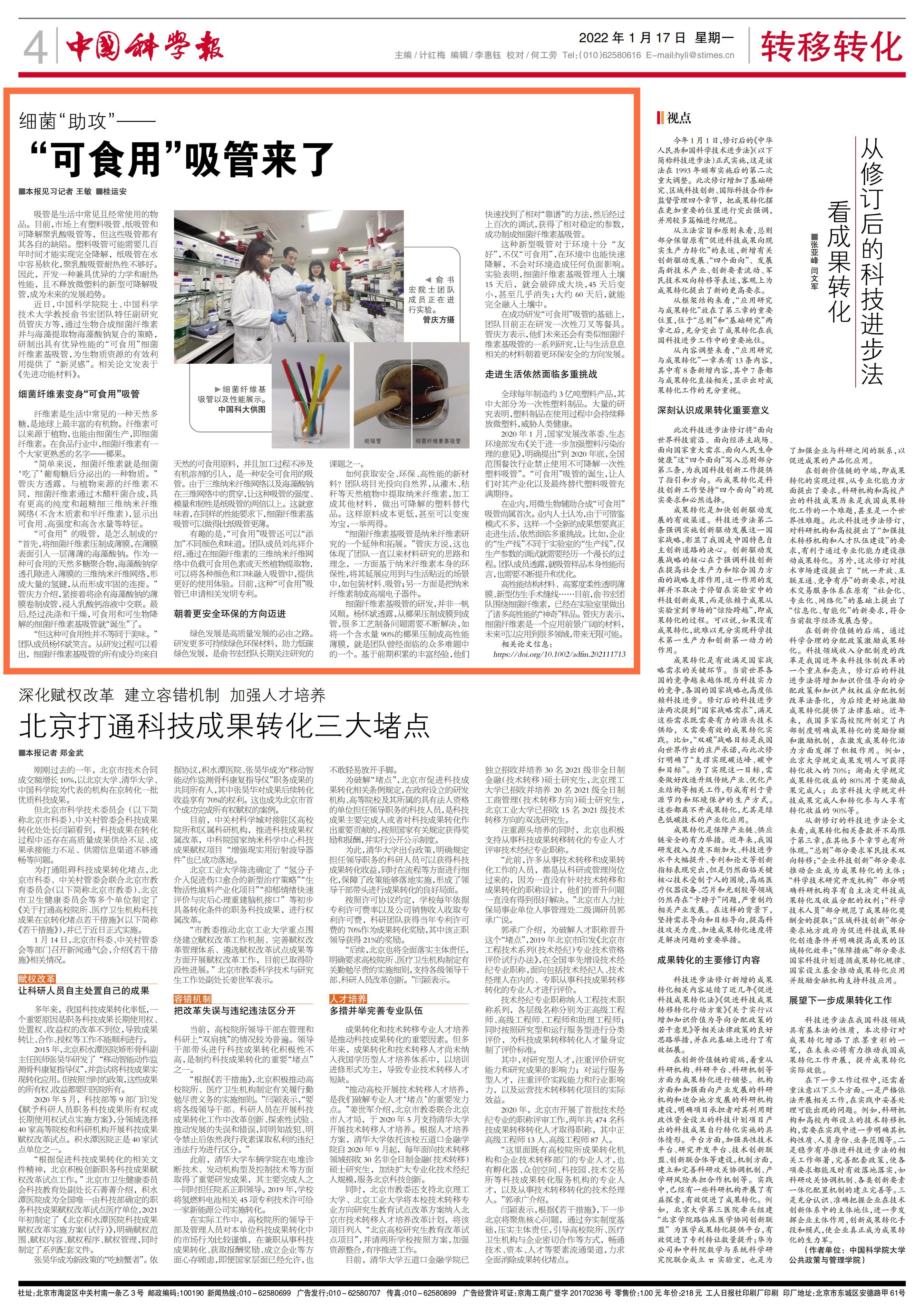 《中国科学报》 (2022-01-17 第4版 转移转化)