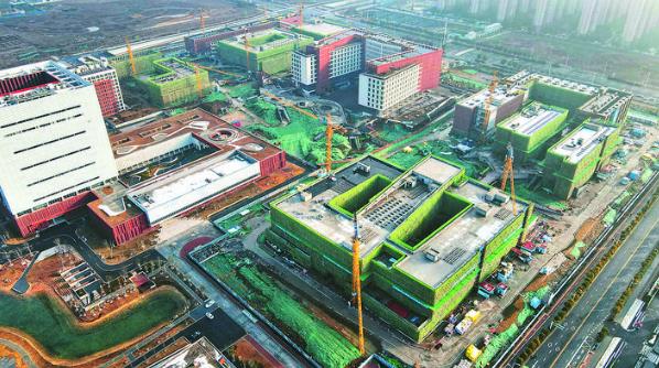 近日航拍的中国科学技术大学高新园区(一期)项目。该项目现已全面进入精装修幕墙施工阶段,同时室外管网及道路景观也已全面展开施工。据了解,该项目计划于今年7月30日前完成所有室内外工程。记者 宋炎骏 摄