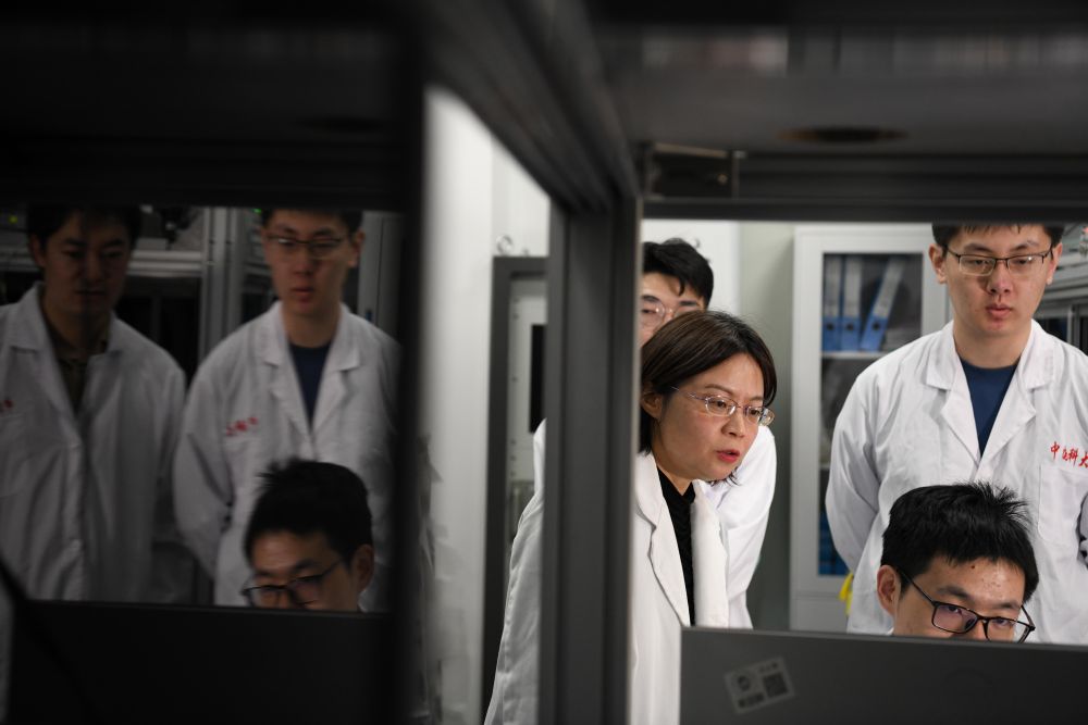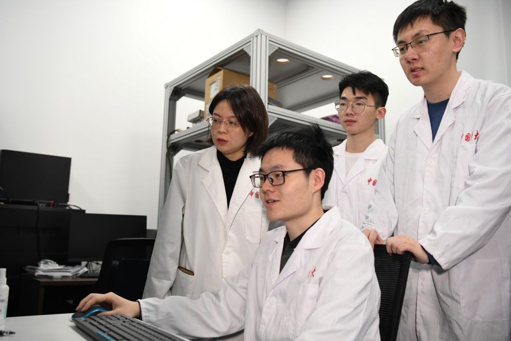 3月6日,在中国科学技术大学内,彭新华教授(右三)与团队成员在中国科学院微观磁共振重点实验室内讨论。