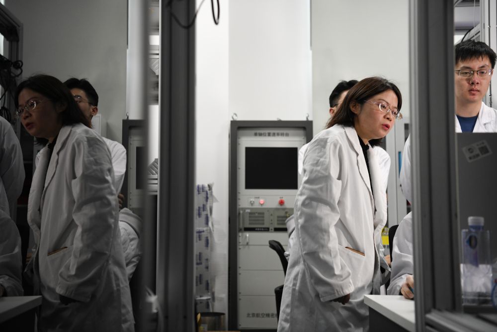 3月6日,在中国科学技术大学内,彭新华教授(右)与团队成员在中国科学院微观磁共振重点实验室内交流。