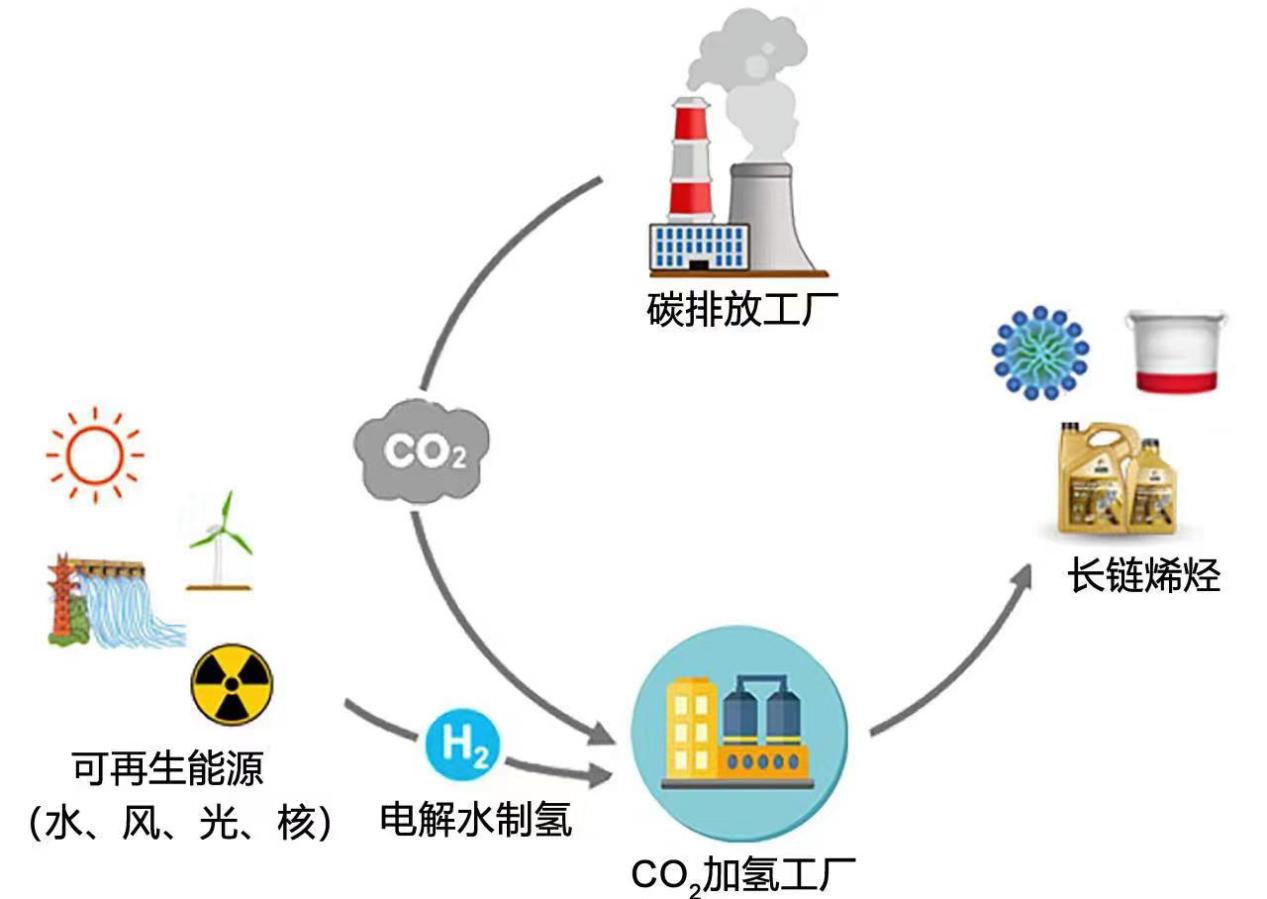 长链烯烃在精细化工领域具有广泛应用。目前,工业合成长链烯烃的普遍方法是基于乙烯的齐聚反应,而乙烯主要来自石油资源。与之相比,利用可再生能源电解水制氢,再与二氧化碳反应直接制备长链烯烃,则会产生巨大的环境效益。