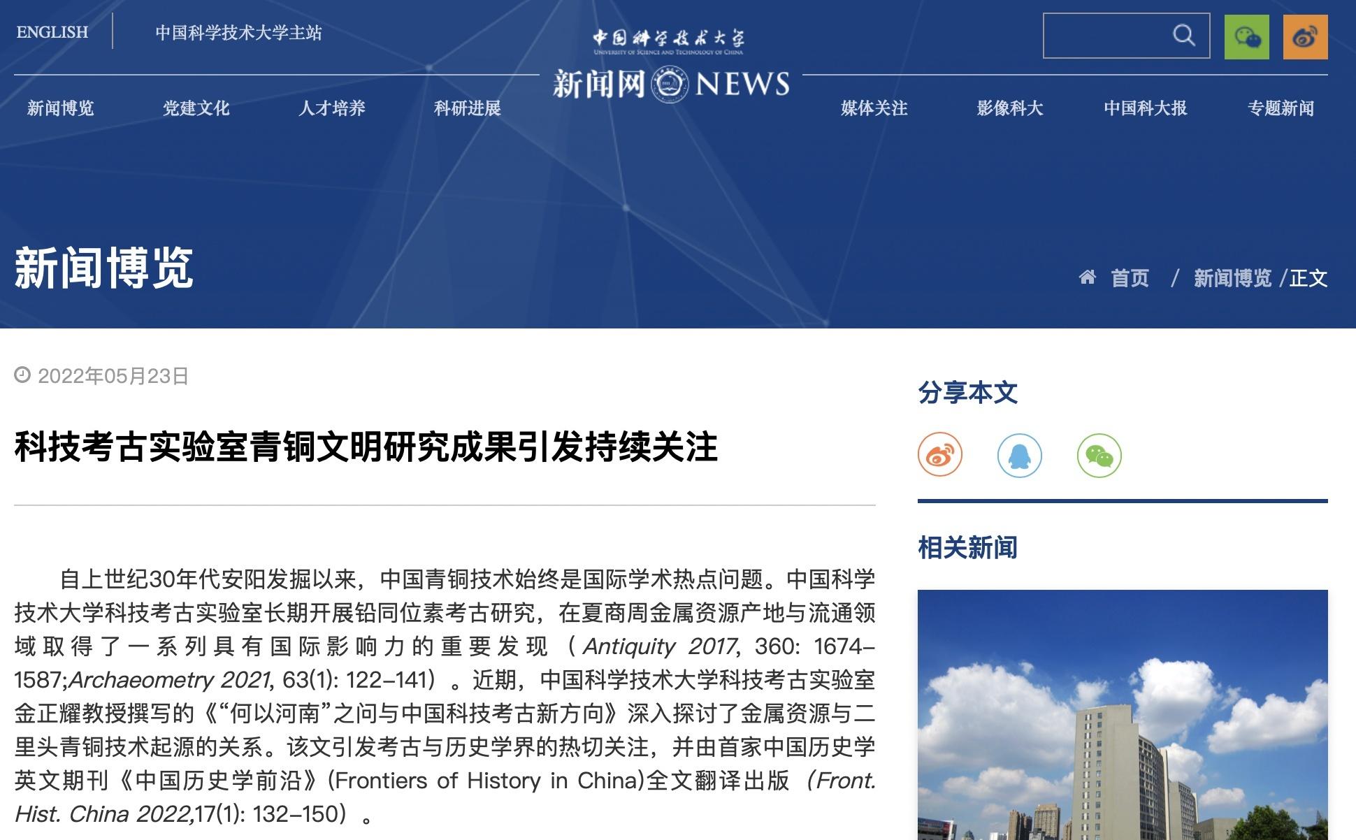 近期,中国科学技术大学科技考古实验室金正耀教授撰写的《“何以河南”之问与中国科技考古新方向》深入探讨了金属资源与二里头青铜技术起源的关系。该文引发考古与历史学界的热切关注,并由首家中国历史学英文期刊《中国历史学前沿》(Frontiers of History in China)全文翻译出版。