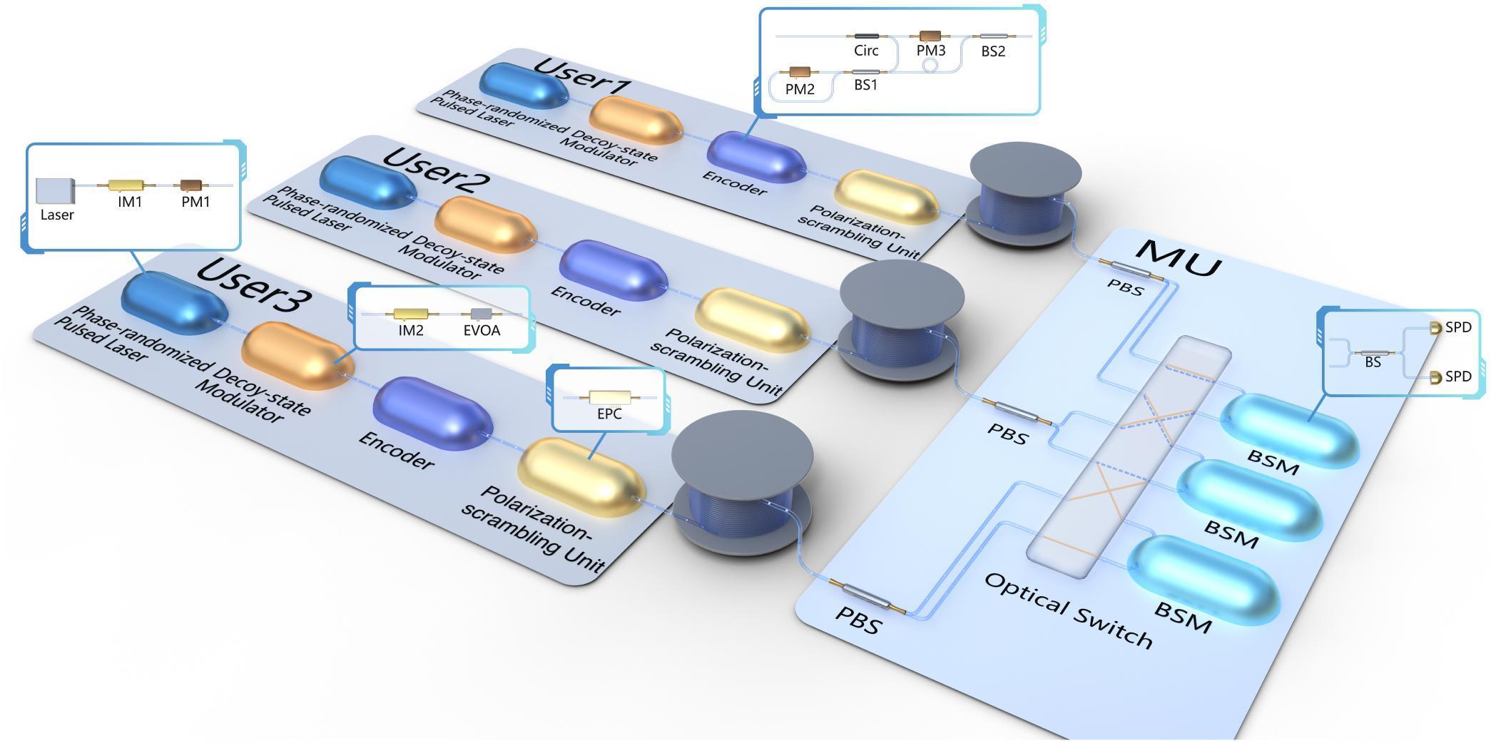 测量设备无关量子密钥分发协议通过设置一个非可信节点对编码量子态进行联合测量,可在两个用户间构建安全的通信链路,是构建百公里级城域量子网络的重要角色。然而联合测量不仅限定了参与用户的数量,还对信道环境的稳定性提出了更高的要求,不利于在复杂网络环境下进行部署。科研团队多年来围绕这一问题展开深入研究。通过一系列技术攻关,科研团队完成了测量设备无关量子密钥分发网络的构建,使其同时具备抗环境干扰、无需可信节点、支持多用户灵活组网的特性。该成果推动了下一代量子保密通信网络的实用化,为未来量子互联网的具体形态做出了有益的探索。