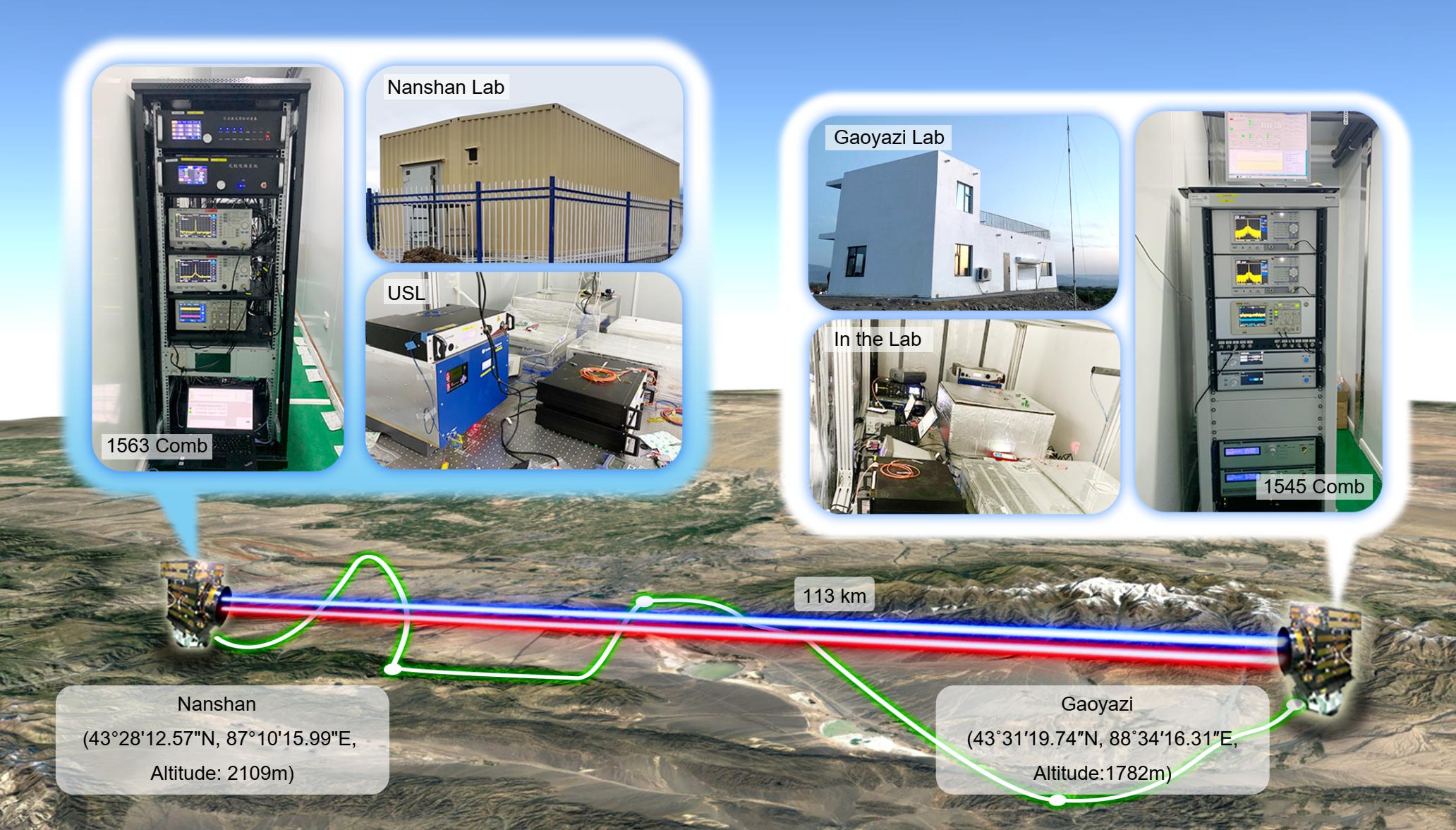 中科大科研团队向这一难题发起挑战。他们研制出高功率、高稳定度光梳,以及高稳定性、高效率的光收发望远镜系统,采用线性光学采样的干涉测量方式,实现高精度的时间测量。经过一系列技术攻关,最终基于双飞秒光梳和线性光学采样,在相隔113公里的新疆南山天文台和高崖子天文台之间,实现了万秒10的负19次方量级稳定度的时频传递。