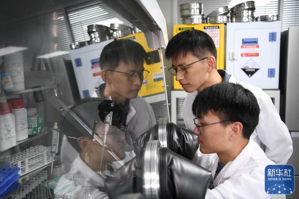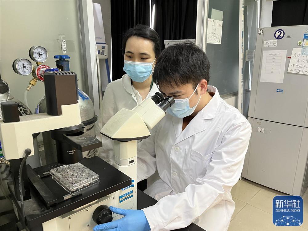 10月20日,广东中山大学中山医学院博士研究生张贤涛(右)在实验室。新华社发