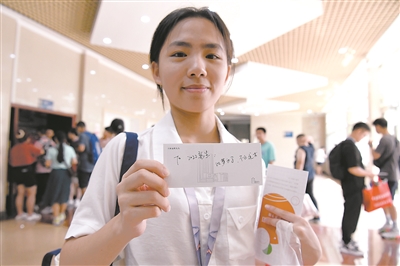 8月21日,中国科学技术大学2022级本科新生陈烨泓展示写有学长学姐祝福的明信片。 新华社记者 张端 摄
